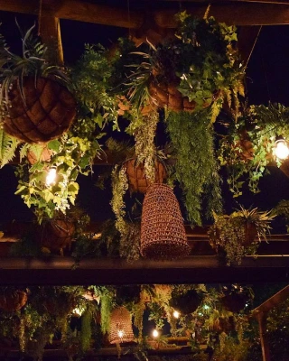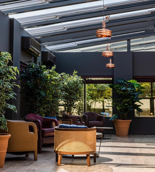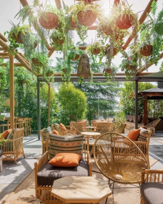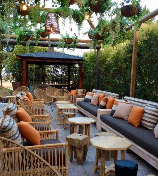 Una zona exterior exclusiva rodeada de vegetación, equipada con sofás, sillones y mesas altas. Ideal para cócteles, celebraciones al aire libre o como complemento perfecto a la sala principal.